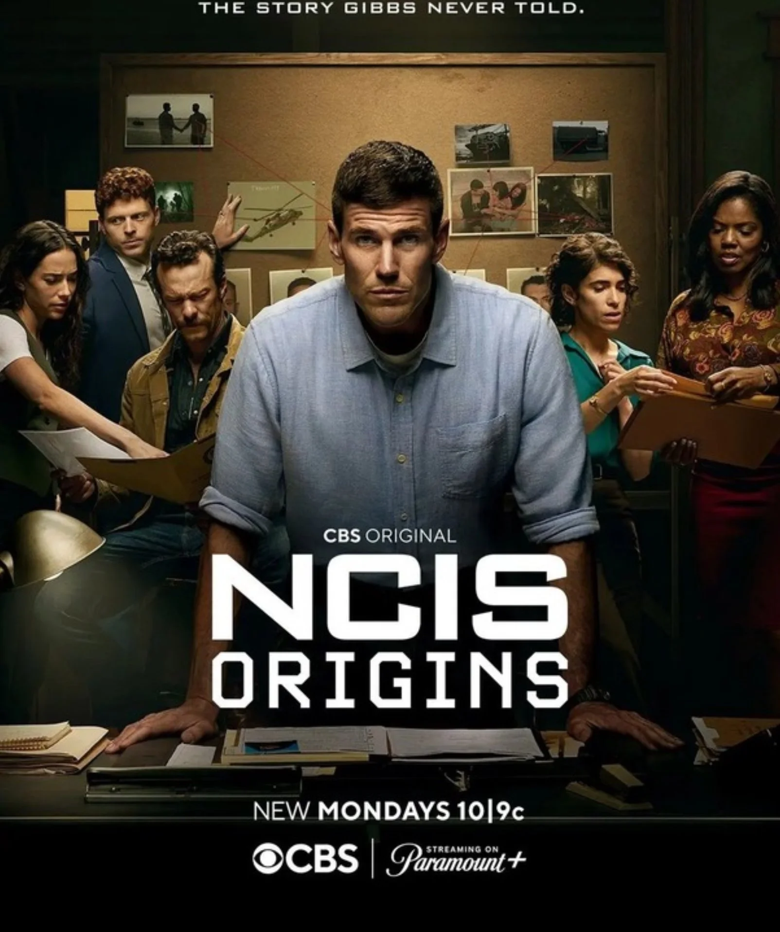 Promotional poster for NCIS Origins featuring a stern, determined man in a dark navy suit set against a moody, shadowy background with bold title text reading “NCIS Origins.”