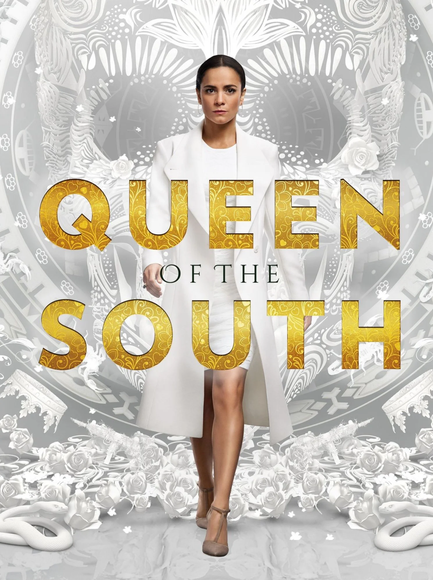 Woman in white coat standing amid white roses with the text "Queen of the South" in gold letters.