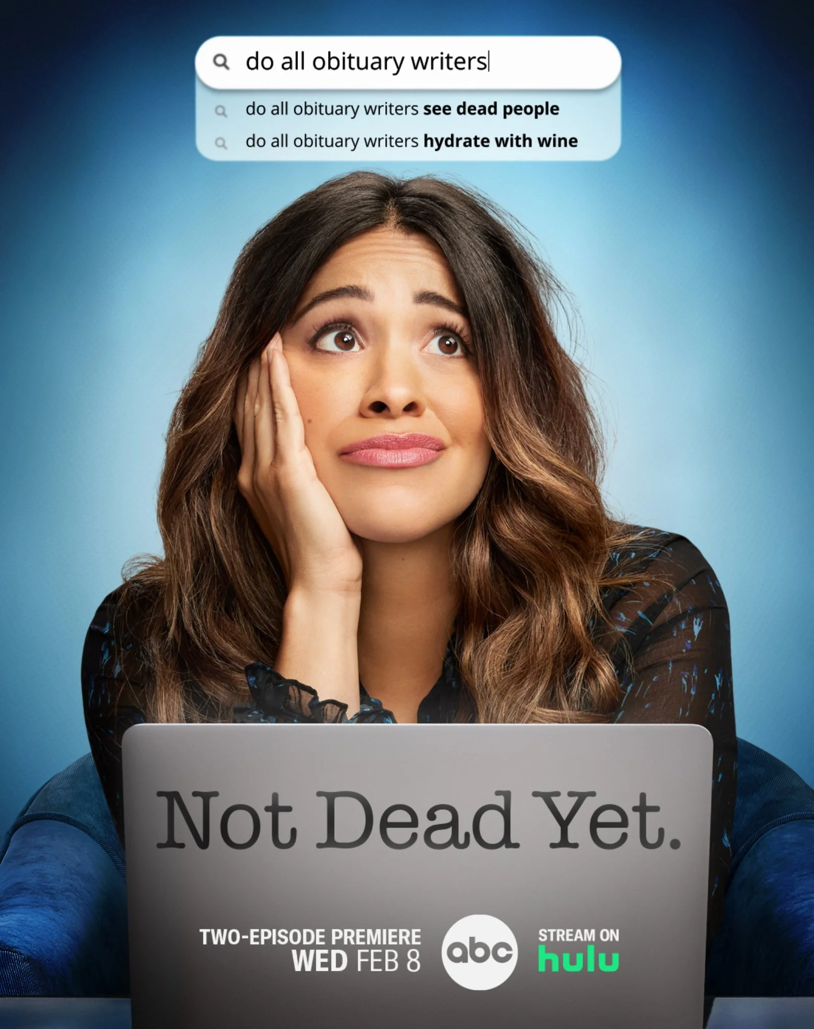 Promotional image for "Not Dead Yet" showing a woman looking up with a thoughtful expression, sitting behind a laptop with the show's title. A search bar over the image displays humorous queries about obituary writers. ABC and Hulu logos are at the bottom with premiere details.
