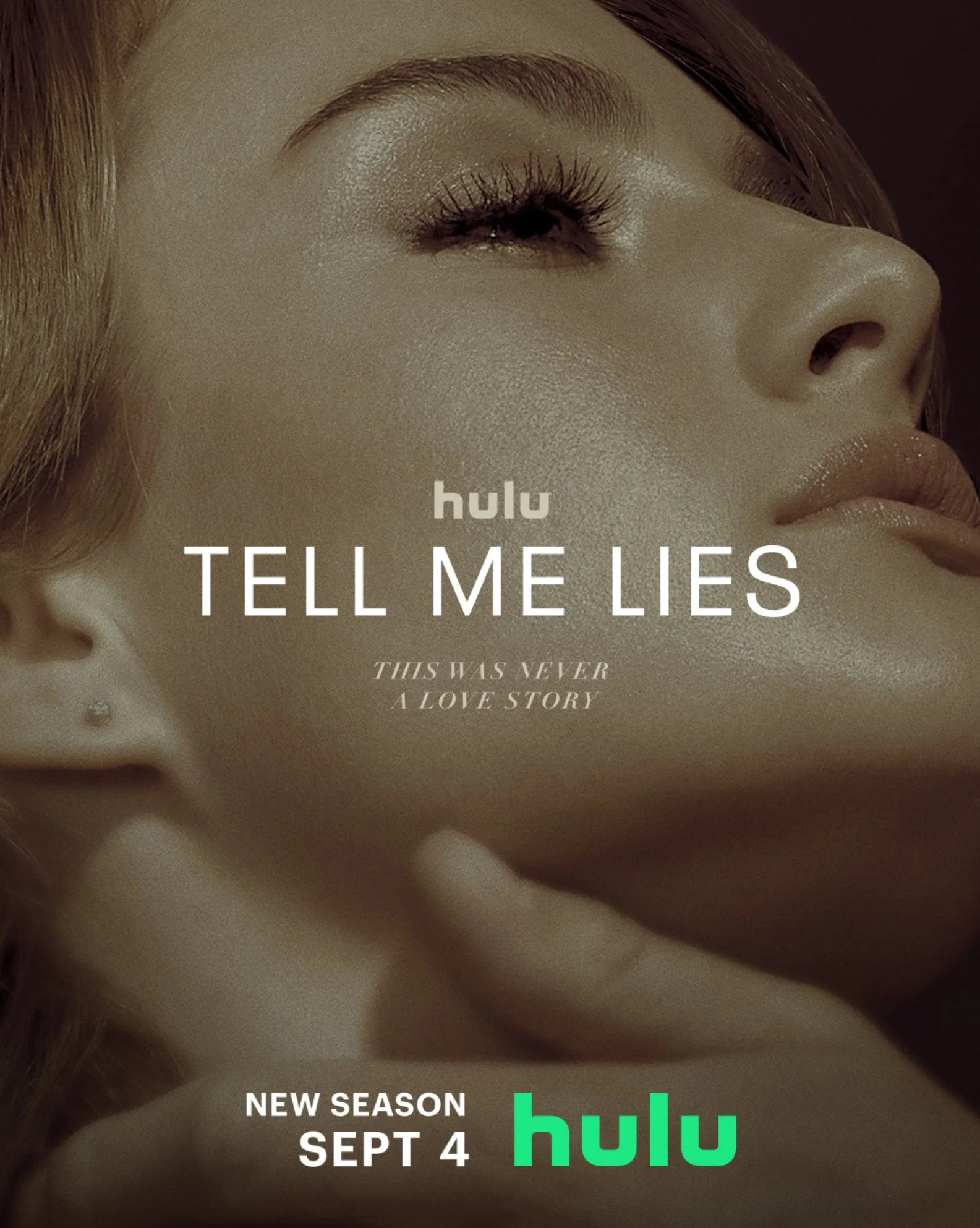 Promotional poster for “Tell Me Lies” featuring a close-up portrait of a young woman with intense, expressive eyes and soft lighting, set against a dark, moody background with the title “Tell Me Lies” elegantly overlaid.